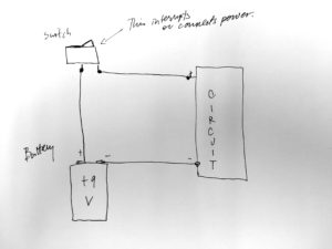 - If you are feeling wild, see below for ideas about how to add an on/off switch to your circuit, and /or how to add LEDs. It would be possible to add an LED to the signal output or as an on/off indicator. We will be talking more abou these components as we go along.